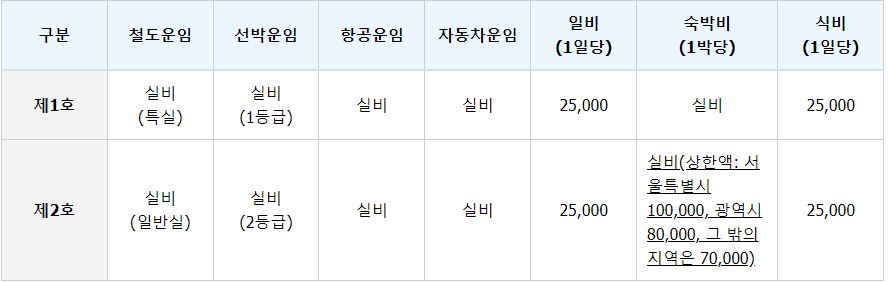 교통비와 숙박료를 지급해줍니다. 교통비는 거주지로부터 방문 사업장까지의 거리와 교통수단에 따라 계산됩니다. 숙박료는 숙박한 밤의 수에 따라 지급되며, 지역별로 상한액이 정해져 있습니다.
