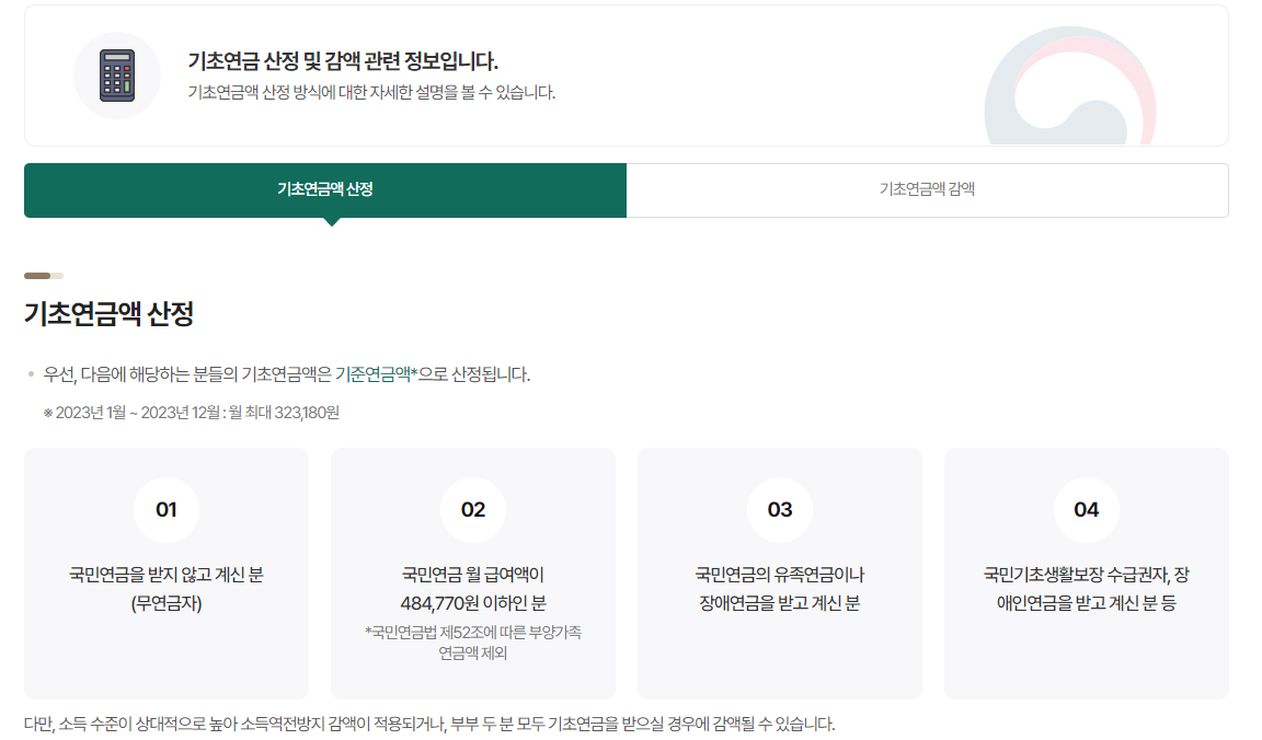 - (소득역전방지 감액) 소득인정액과 기초연금액(부부2인 수급가구는 부부감액 적용 이후)을 합산한 금액이 선정기준액 이상인 경우에는 선정기준액을 초과하는 금액의 범위에서 기초연금액의 일부를 감액