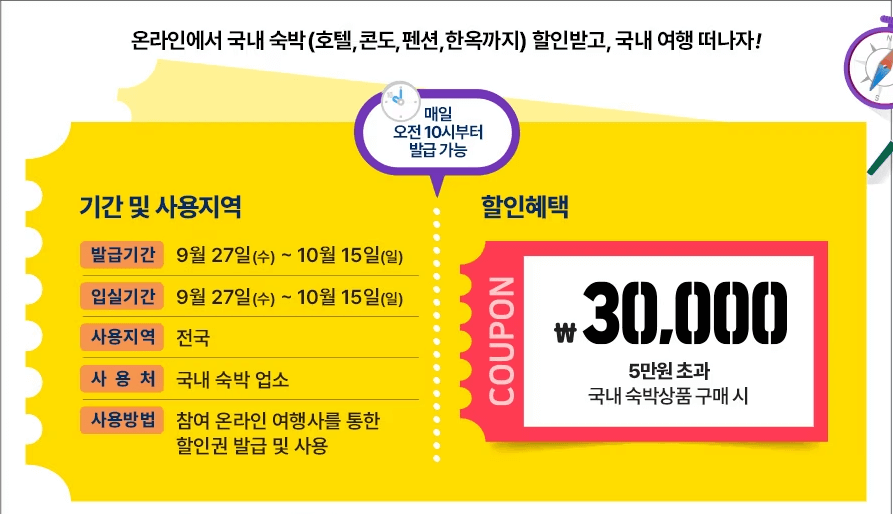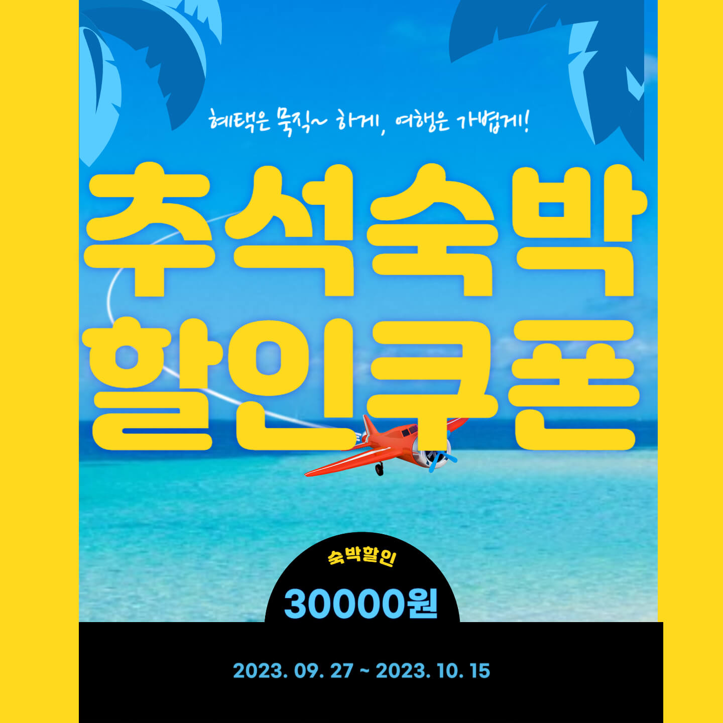 추석 연휴가 6일이 된 올해, 정부가 추석 연휴를 맞아 국내여행을 활성화하고자 전국 각지에서 사용할 수 있는 추석숙박 할인쿠폰 30000원을 선착순 30만 명에 한해 발급한다고 합니다. 아래 글을 읽어 보시면 혜택과 주의사항에 대해 자세히 나와 있으니 읽어 보시고 손해 보시지 않기를 바랍니다. 지금 바로 신청날짜와 주의 사항 등에 대해 알아보겠습니다.
